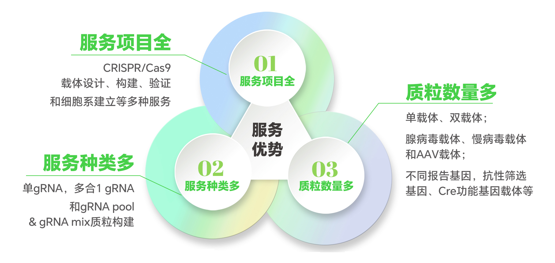 1. 服务项目全:维真生物可以提供从gRNA序列设计、gRNA质粒构建、高效gRNA序列筛选、病毒包装和细胞系建立等多种灵活性服务,以满足科研工作者不同的实验需求;