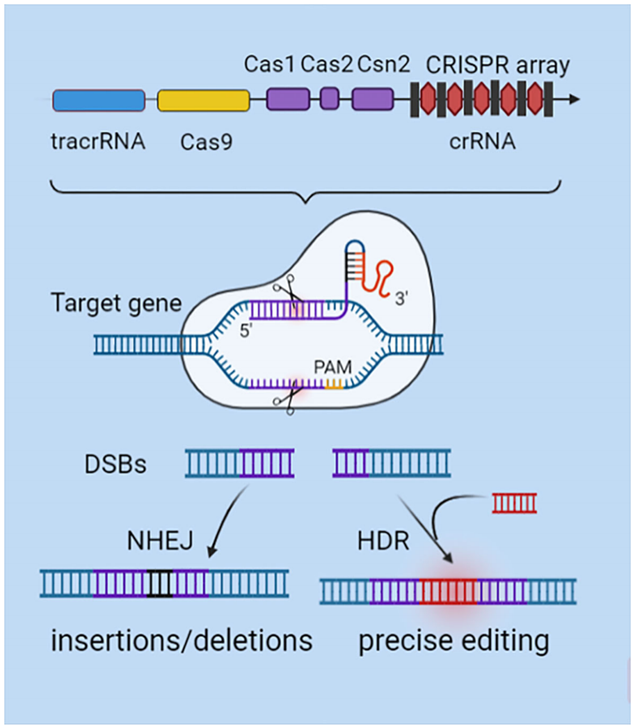 在外源基因两端分别添加靶点DNA两侧的同源片段并构建到donor载体中,然后将CRISPR/Cas系统和donor载体共同转入细胞内。CRISPR/Cas系统在特定靶点切割DNA双链,产生DNA双链断裂(DSB),进而触发细胞的DNA修复过程,当通过HDR修复DSB时,携带外源基因的donor载体能作为HDR的模板进行DNA修复,进而实现将外源基因精准的插入到特定靶点。然后利用载体对应抗性完成药筛后进行单克隆筛选(若敲入了荧光报告基因也可通过观察荧光进行初步筛选),并通过靶位点扩增验证和测序验证筛选出成功实现靶位点片段敲入的阳性单克隆。