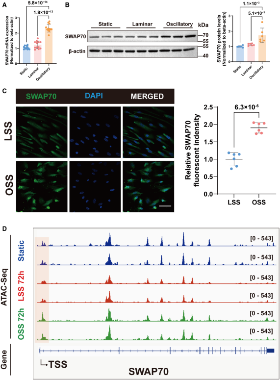 研究发现SWAP70的表达受到遗传因素(CAD风险等位基因rs10840293)和血流动力学因素的共同调控,并在动脉粥样硬化斑块的内皮细胞中特异性富集,提示其在斑块发生发展中具有重要作用。体外实验中,人脐静脉内皮细胞(HUVECs)经振荡剪切应力(OSS)处理后,与层流剪切应力(LSS)组相比,SWAP70的mRNA表达和蛋白表达均显著升高;免疫荧光染色进一步证实,OSS刺激使HUVECs中SWAP70的荧光强度明显增强,直接佐证其表达上调。YAP/TAZ转录共激活复合物是已知的力学敏感调控因子,可驱动促炎基因表达并破坏血管稳态。通过RNA-seq数据分析发现,YAP敲低会显著降低SWAP70的mRNA水平,而YAP过表达则会促进SWAP70的转录;公共ChIP-seq数据进一步显示,YAP和TAZ均在SWAP70的启动子区域高度富集,证实SWAP70 是YAP/TAZ复合物的直接转录靶标。ATAC-seq分析表明OSS通过增强 SWAP70启动子染色质可及性促进转录。