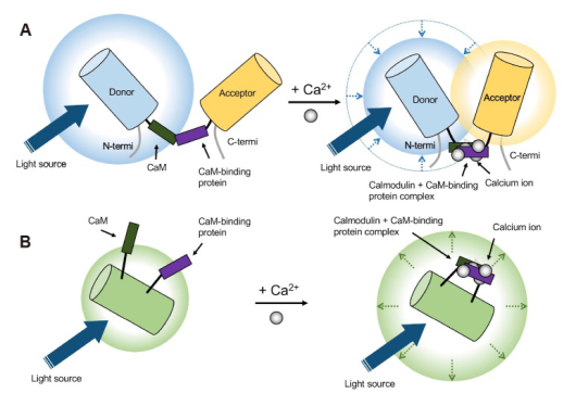 在GECIs中,以结构导向设计的GCaMP应用最为广泛。GCaMPs是单个绿色荧光蛋白GFP、钙调蛋白CaM和平滑肌细胞肌球蛋白轻链激酶片段M13融合的产物。在Ca2+存在的情况下,CaM会和M13结合,大大增加荧光的强度。其结构示意图和成像原理如下图所示。