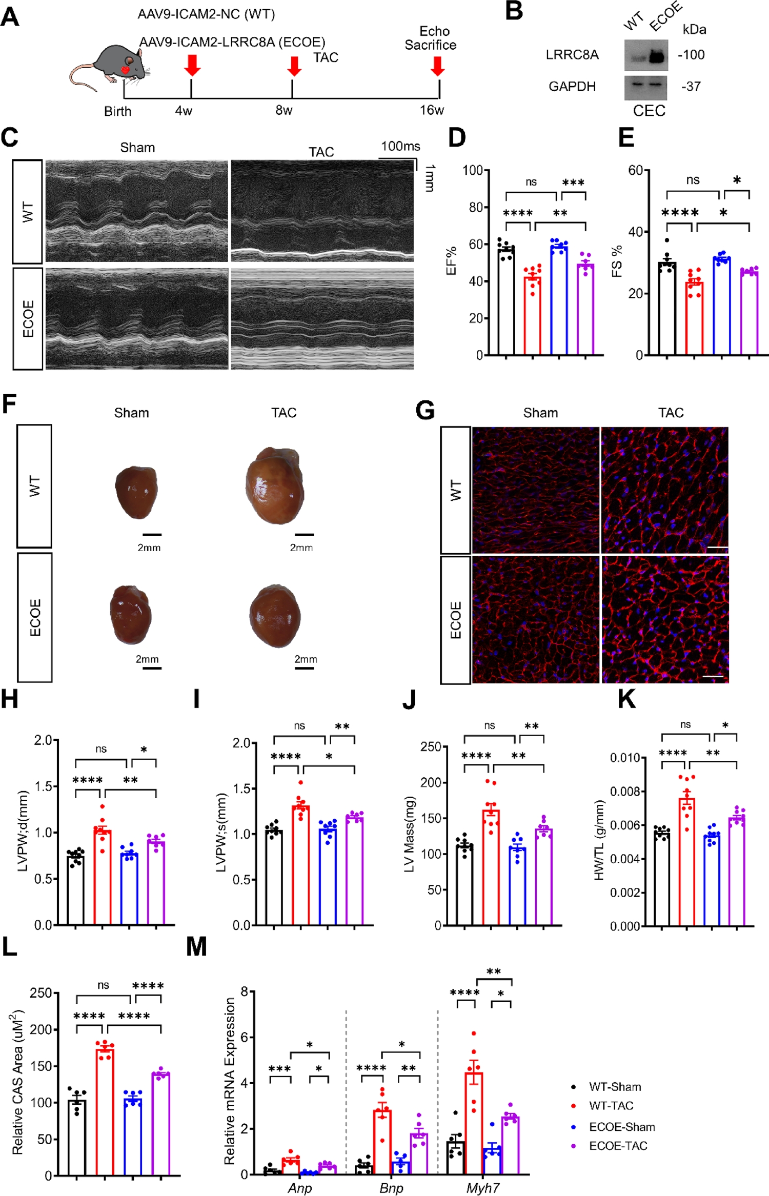 作者探究了LRRC8A过表达能否预防TAC诱导的病理性肥大和功能障碍,使用AAV9-ICAM2-LRRC8A生成内皮细胞特异性表达LRRC8A小鼠(ECOE),然后对ECOE和WT小鼠进行TAC手术,发现与WT-TAC小鼠相比,ECOE-TAC组的EF%和FS%得到改善,从而恢复了TAC诱导的心脏功能障碍。此外内皮LRRC8A过表达减弱了TAC诱导的病理性肥大,表现为HW/TL、LWPW、LWPWd、LV质量和心肌细胞横截面积减少,还明显降低了TAC诱导的Anp、Bnp和Myh7基因表达。作者进一步研究了内皮LRRC8A过表达对病理性肥厚心脏毛细血管密度的影响,发现与WT-TAC相比,ECOE-TAC心脏的毛细血管密度上调,血管生成标记物(包括VEGFR2和CD31)水平升高。这些结果表明AAV介导的LRRC8A过表达通过促进血管生成来恢复TAC诱导的病理性肥大和功能障碍。