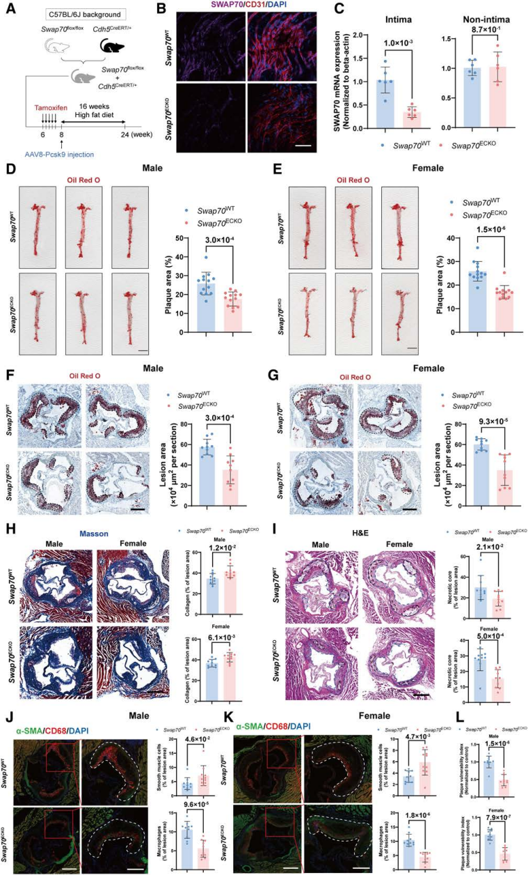 研究团队构建了内皮特异性Swap70敲除小鼠,经AAV8-Pcsk9^D377Y注射+16周高脂饮食喂养后,其体重、血浆总胆固醇、甘油三酯、高低密度脂蛋白胆固醇及肝酶水平与野生型小鼠无显著差异,排除代谢因素对实验结果的干扰。油红O染色显示,Swap70ᵉᶜᴷᴼ小鼠的主动脉整体及主动脉根部粥样硬化斑块面积显著减少,且该效应在雄性和雌性小鼠中均存在;Masson三色染色显示,敲除小鼠斑块内胶原沉积显著增加;H&E染色表明其斑块坏死核心面积明显缩小;免疫荧光染色证实,斑块中 α-SMA标志物显著上调,CD68⁺巨噬细胞浸润减少。上述结果说明Swap70敲除可提升动脉粥样硬化斑块的稳定性。通过构建内皮细胞特异性Swap70过表达小鼠,发现Swap70过表达则加剧动脉粥样硬化病变并促进斑块不稳定性,进一步确立了SWAP70在内皮功能失调和动脉粥样硬化进展中的关键致病作用。